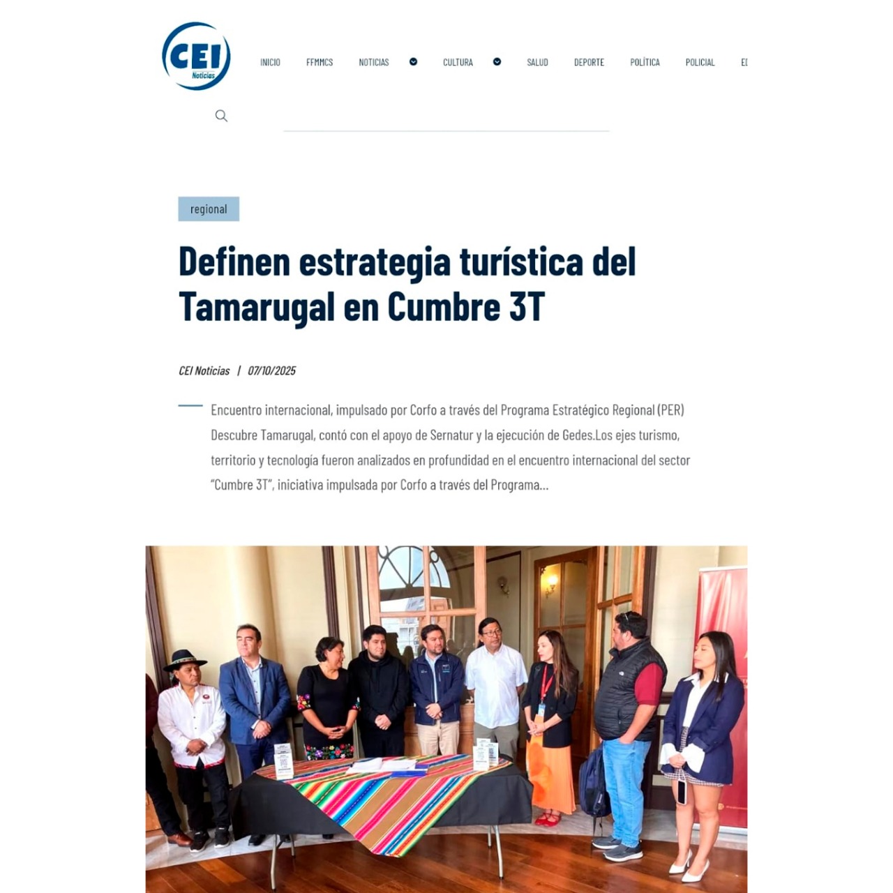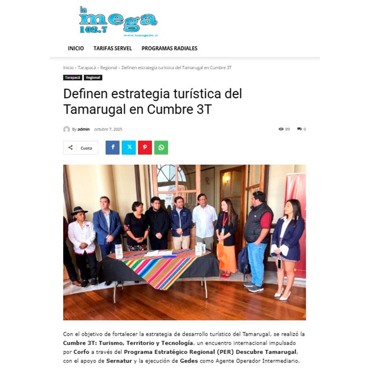 Encuentro internacional, impulsado por Corfo a través del Programa Estratégico Regional (PER) Descubre Tamarugal, contó con el apoyo de Sernatur y la ejecución de Gedes.Los ejes turismo, territorio y tecnología fueron analizados en profundidad en el encuentro internacional del sector “Cumbre 3T”, iniciativa impulsada por Corfo a través del Programa Estratégico Regional (PER) Descubre Tamarugal, el apoyo de Sernatur y la ejecución del Agente Operador Intermediario Gedes.