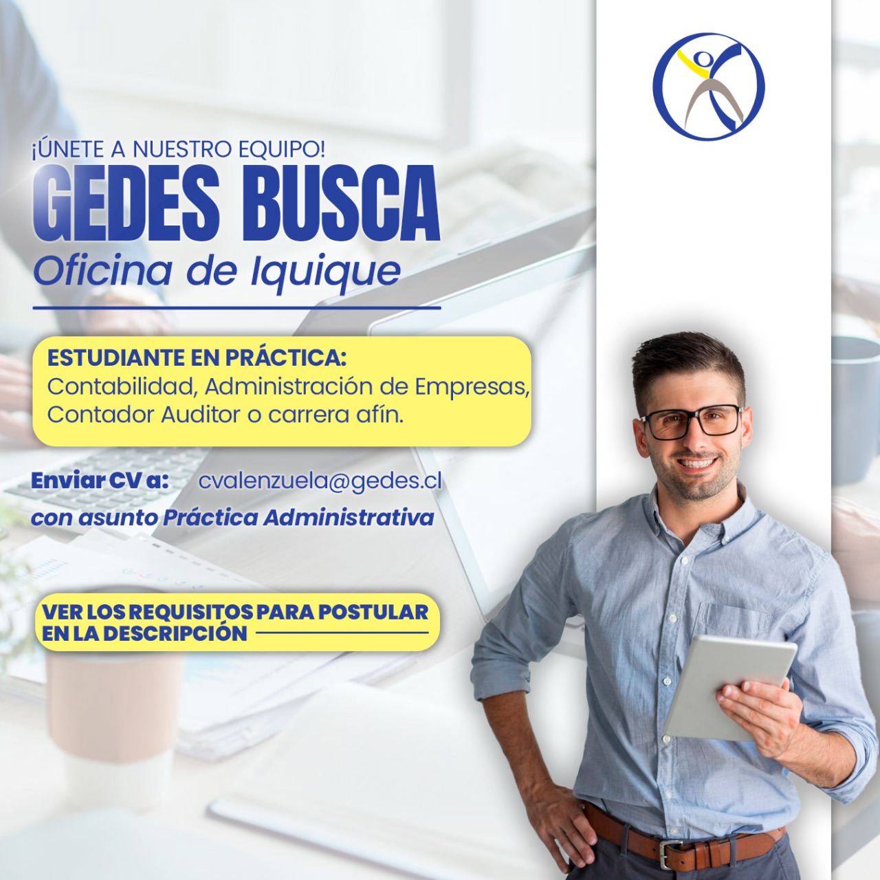 Gedes, empresa multirregional dedicada al desarrollo territorial y la gestión de proyectos, requiere incorporar a su equipo en la sucursal de Iquique a un/a Estudiante en Práctica Profesional del área Contabilidad, Administración de Empresas, Contador Auditor o carrera afín, con opción de continuidad laboral según desempeño.