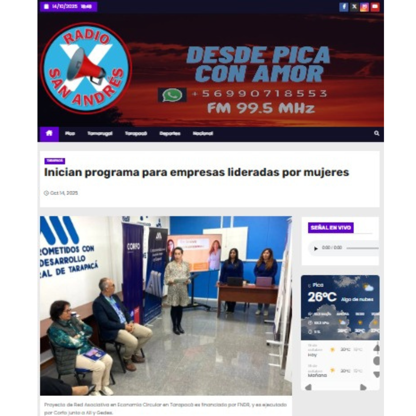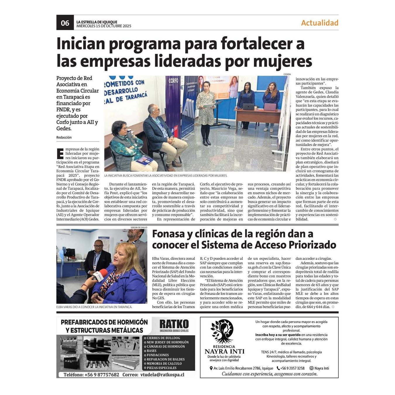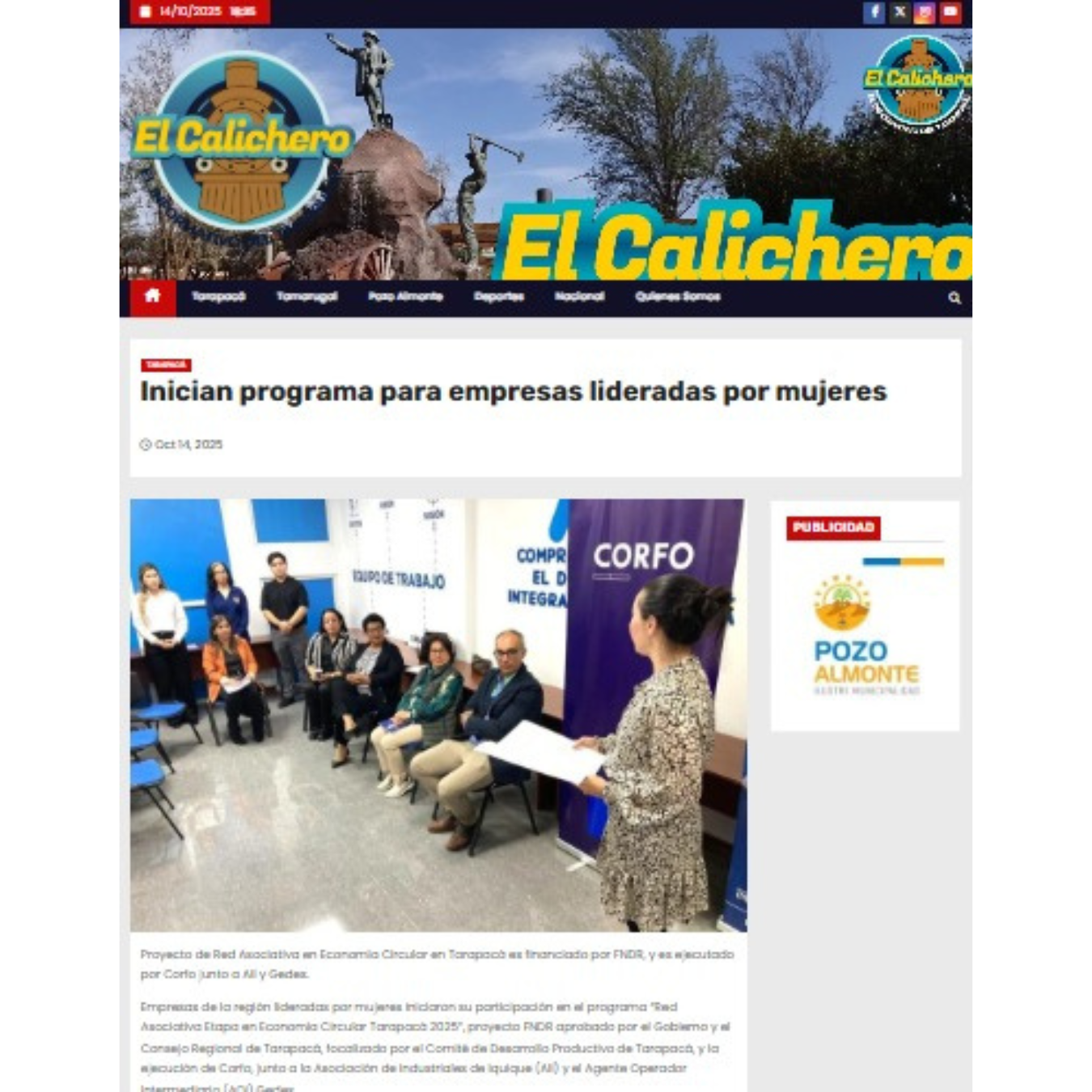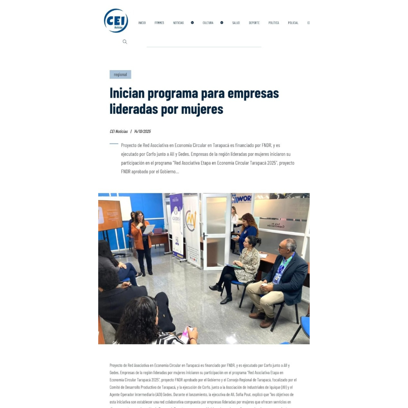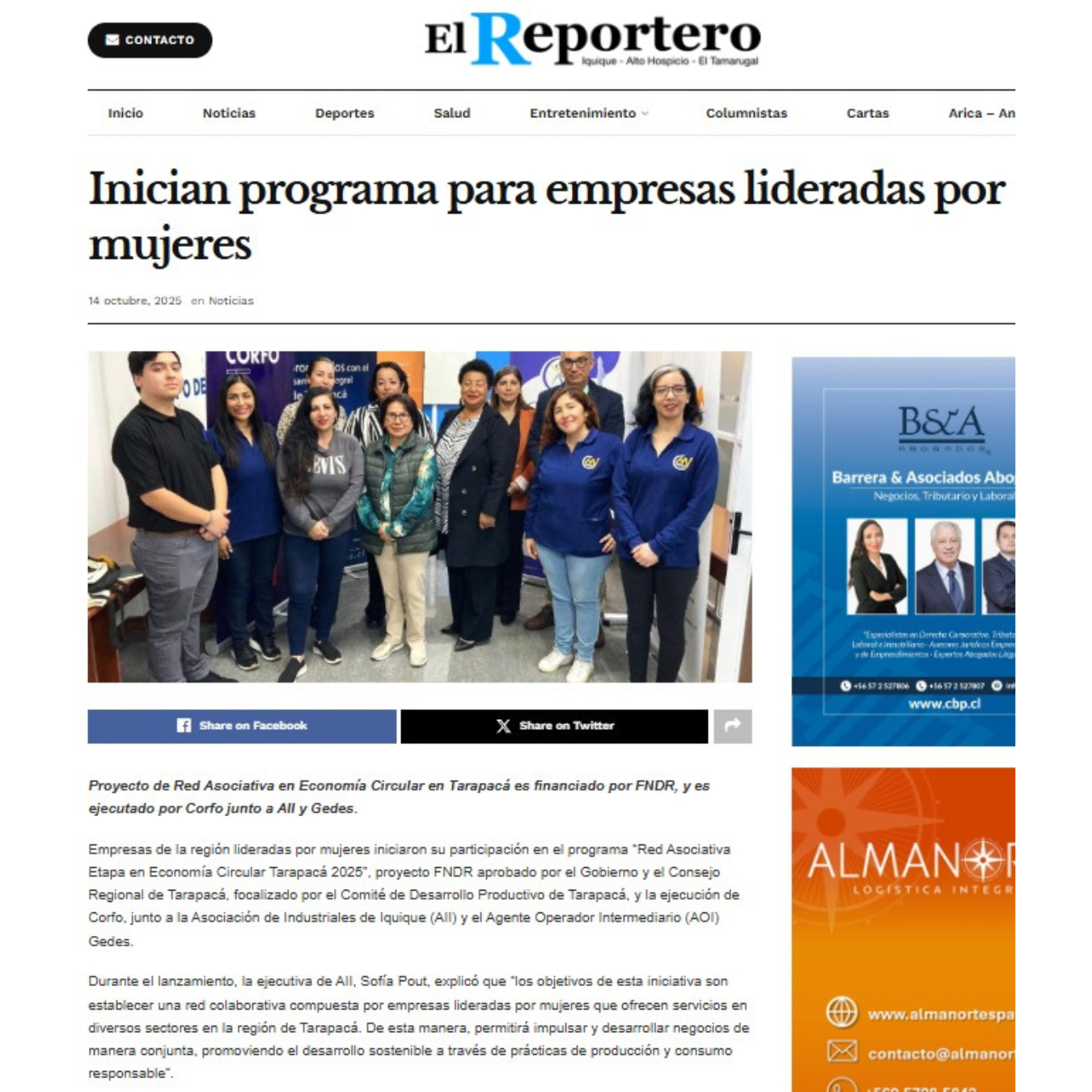 Empresas de la región lideradas por mujeres iniciaron su participación en el programa “Red Asociativa Etapa en Economía Circular Tarapacá 2025”, proyecto FNDR aprobado por el Gobierno y el Consejo Regional de Tarapacá, focalizado por el Comité de Desarrollo Productivo de Tarapacá, y la ejecución de Corfo, junto a la Asociación de Industriales de Iquique (AII) y el Agente Operador Intermediario (AOI) Gedes.