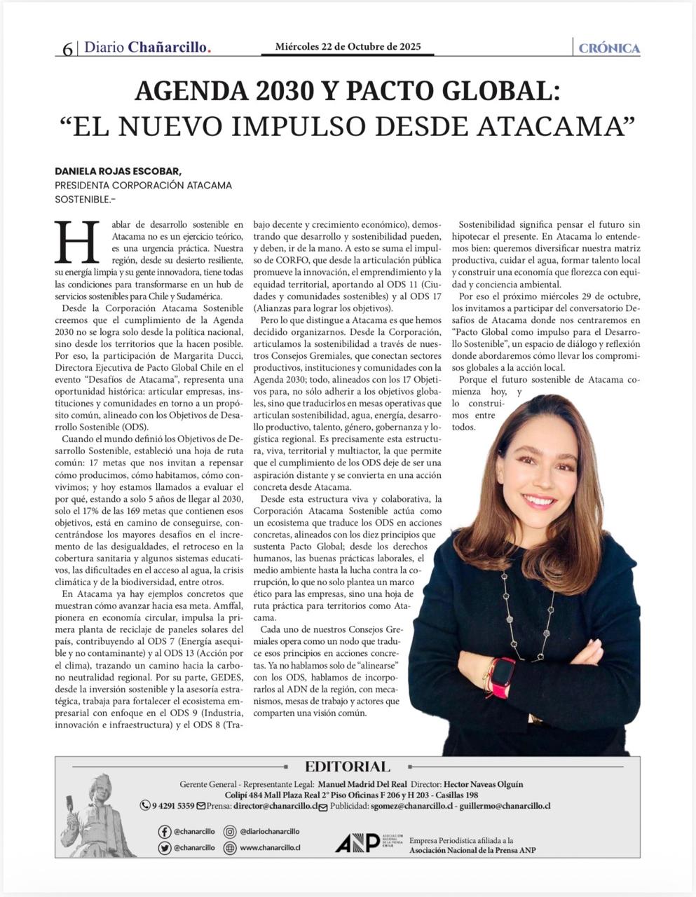 Desde la Corporación Atacama Sostenible creemos que el cumplimiento de la Agenda 2030 no se logra solo desde la política nacional, sino desde los territorios que la hacen posible. Por eso, la participación de Margarita Ducci, Directora Ejecutiva de Pacto Global Chile en el evento “Desafíos de Atacama”, representa una oportunidad histórica: articular empresas, instituciones y comunidades en torno a un propósito común, alineado con los Objetivos de Desarrollo Sostenible (ODS).