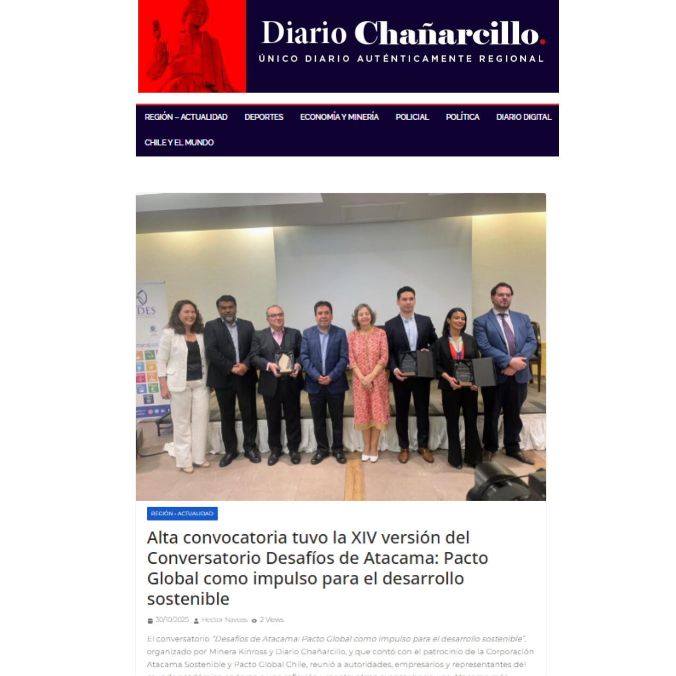 El conversatorio “Desafíos de Atacama: Pacto Global como impulso para el desarrollo sostenible”, organizado por Minera Kinross y Diario Chañarcillo, y que contó con el patrocinio de la Corporación Atacama Sostenible y Pacto Global Chile, reunió a autoridades, empresarios y representantes del mundo académico en torno a una reflexión urgente: cómo avanzar hacia una Atacama más sostenible, innovadora y consciente de su entorno.