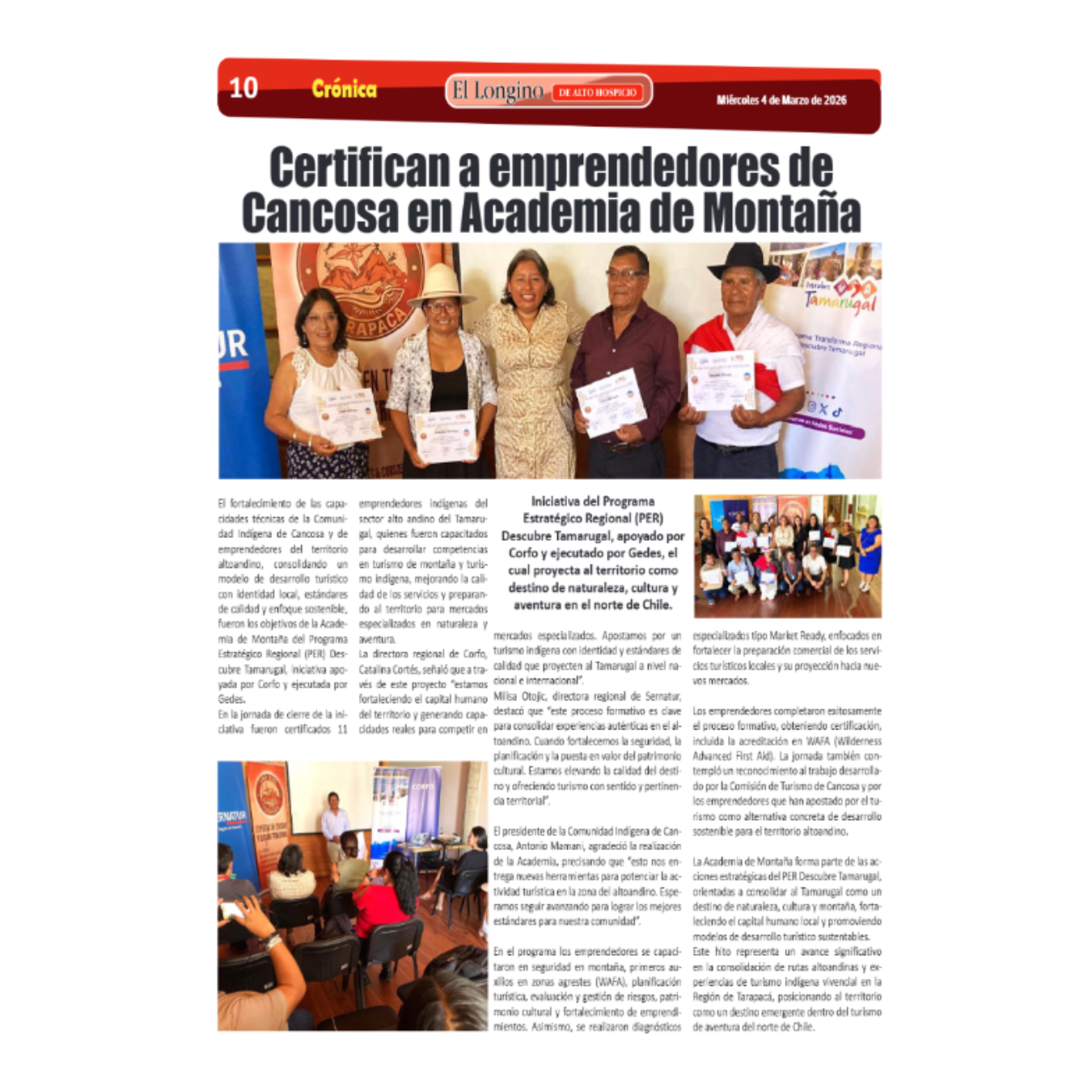 Los emprendedores completaron exitosamente el proceso formativo, obteniendo certificación, incluida la acreditación en WAFA (Wilderness Advanced First Aid). La jornada también contempló un reconocimiento al trabajo desarrollado por la Comisión de Turismo de Cancosa y por los emprendedores que han apostado por el turismo como alternativa concreta de desarrollo sostenible para el territorio altoandino.